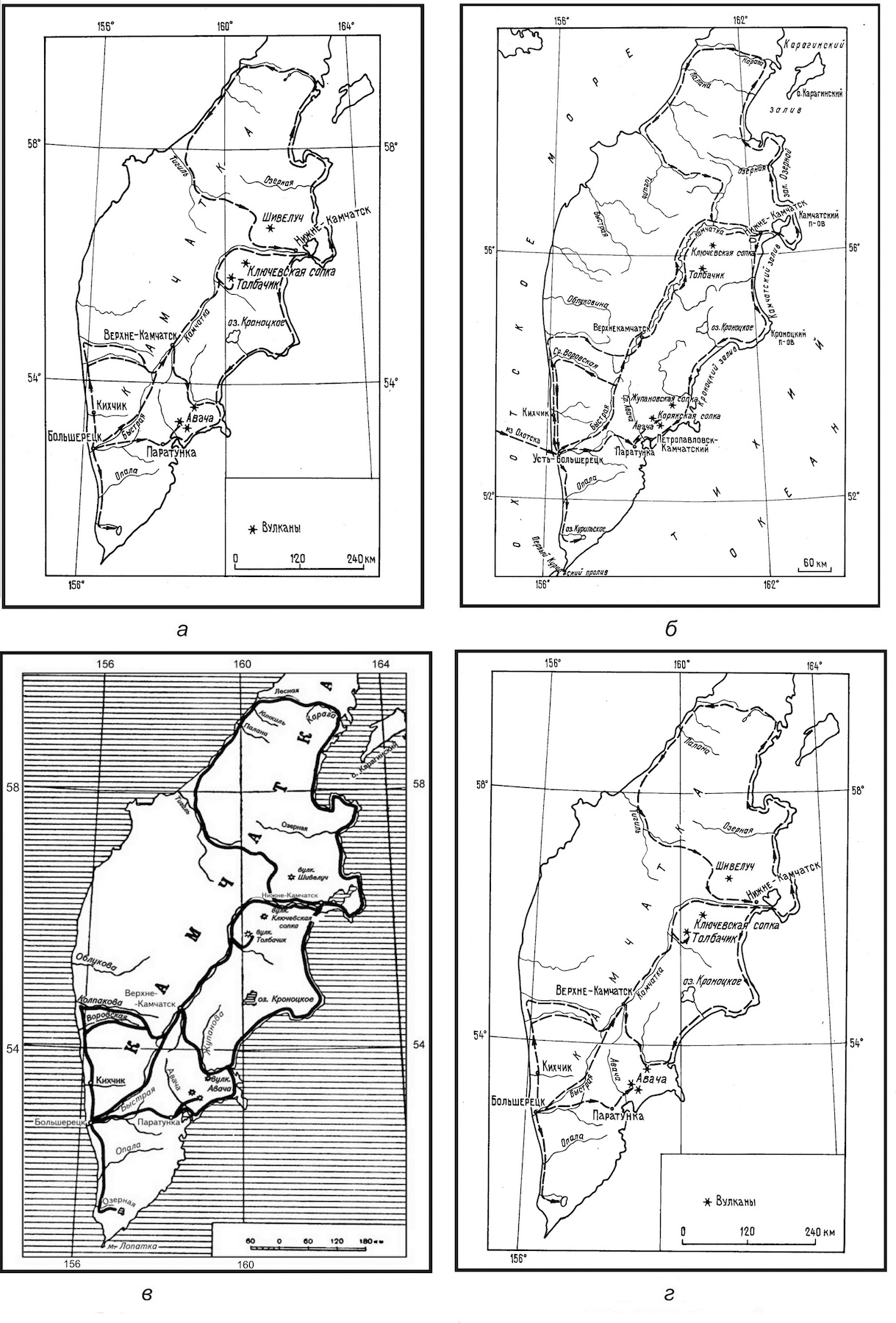 Рис. 2: а – карт-схема П. А. Хоментовского [6, с. 43], б – карт-схема И. П. Магидовича и В. И. Магидовича [12]; в – фрагмент карты Н. Н. Степанова [15, с. 29]; г – обобщённый (без подробностей) вариант карт-схемы основных маршрутов С. П. Крашенинникова по Камчатке [3].
